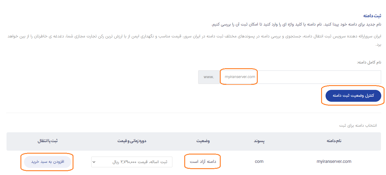 اگر دامنه قبلا توسط شخص دیگری ثبت نشده باشد، در بخش «وضعیت» متن «دامنه آزاد است» را مشاهده خواهید کرد، مثل تصویر زیر: