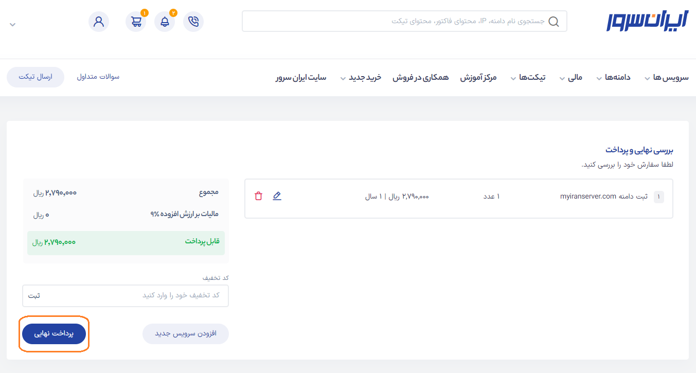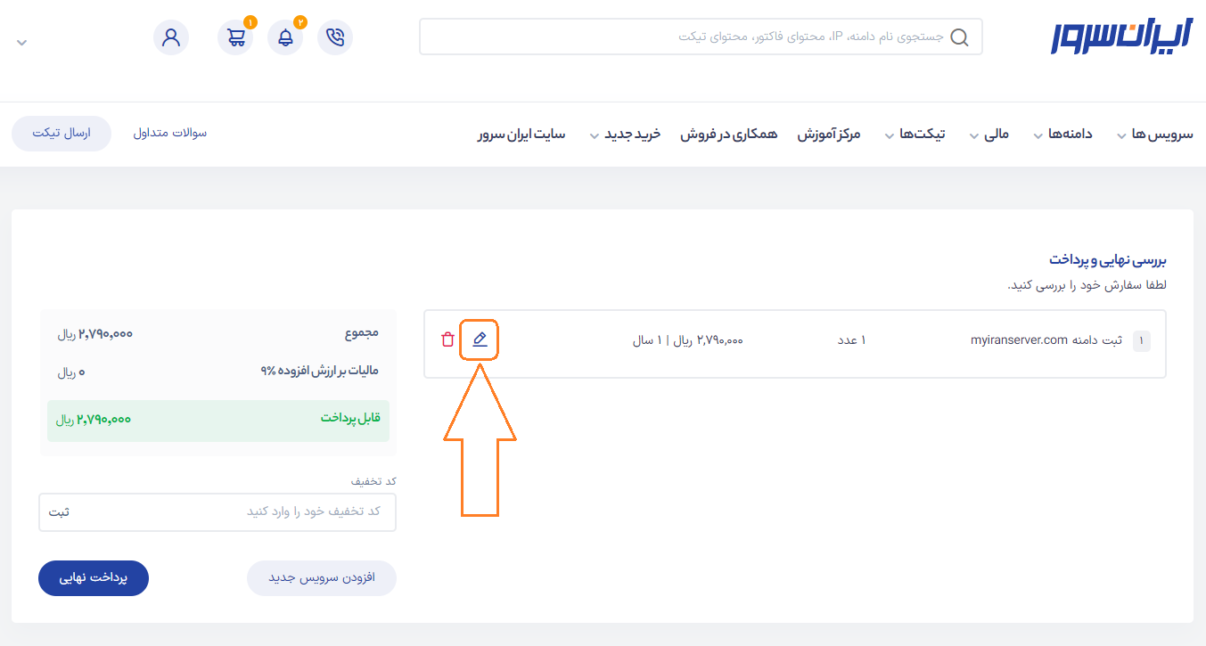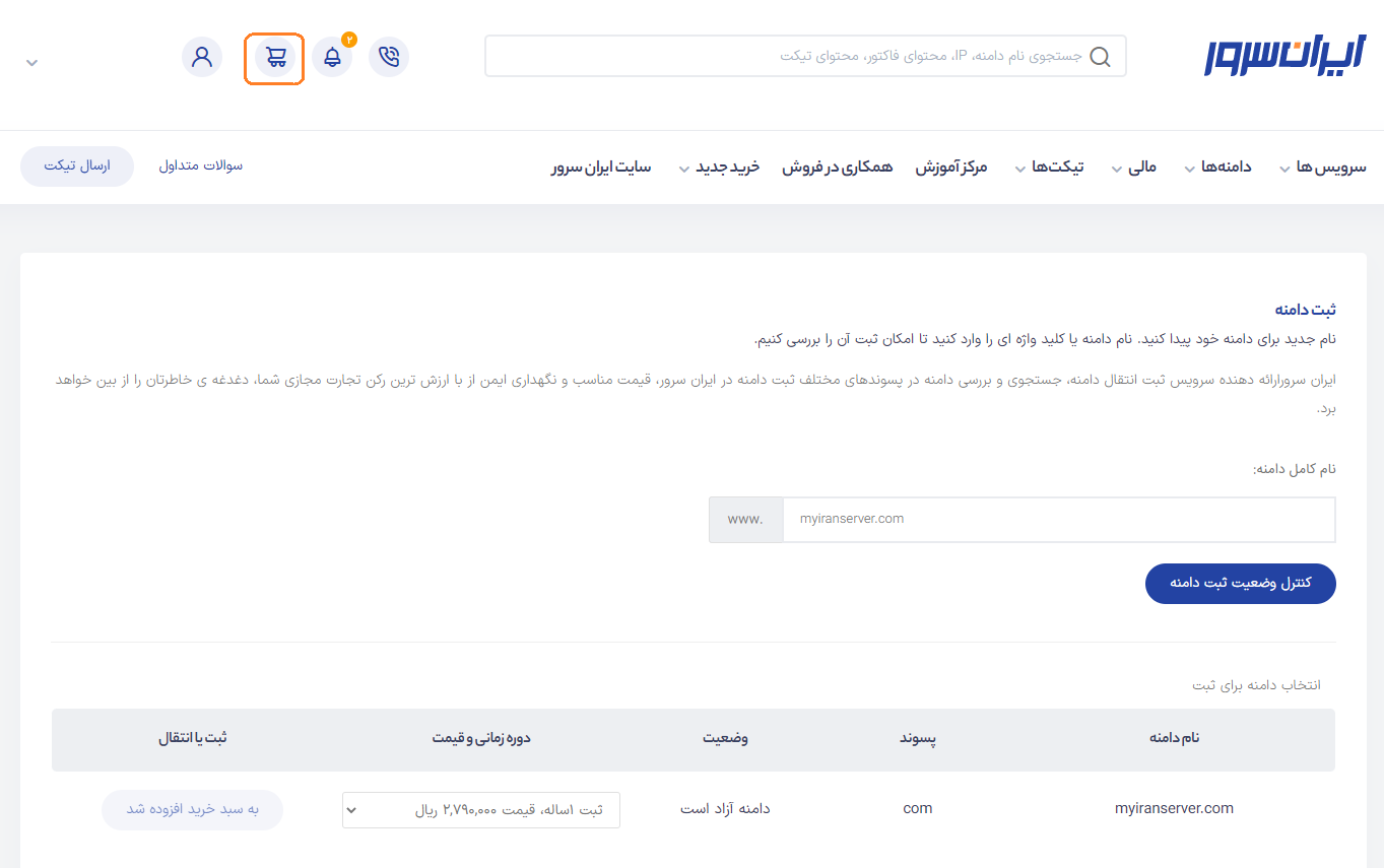 پس از اضافه کردن دامنه به سبد خرید، از بالای صفحه بر روی آیکن سبد خرید کلیک کنید.