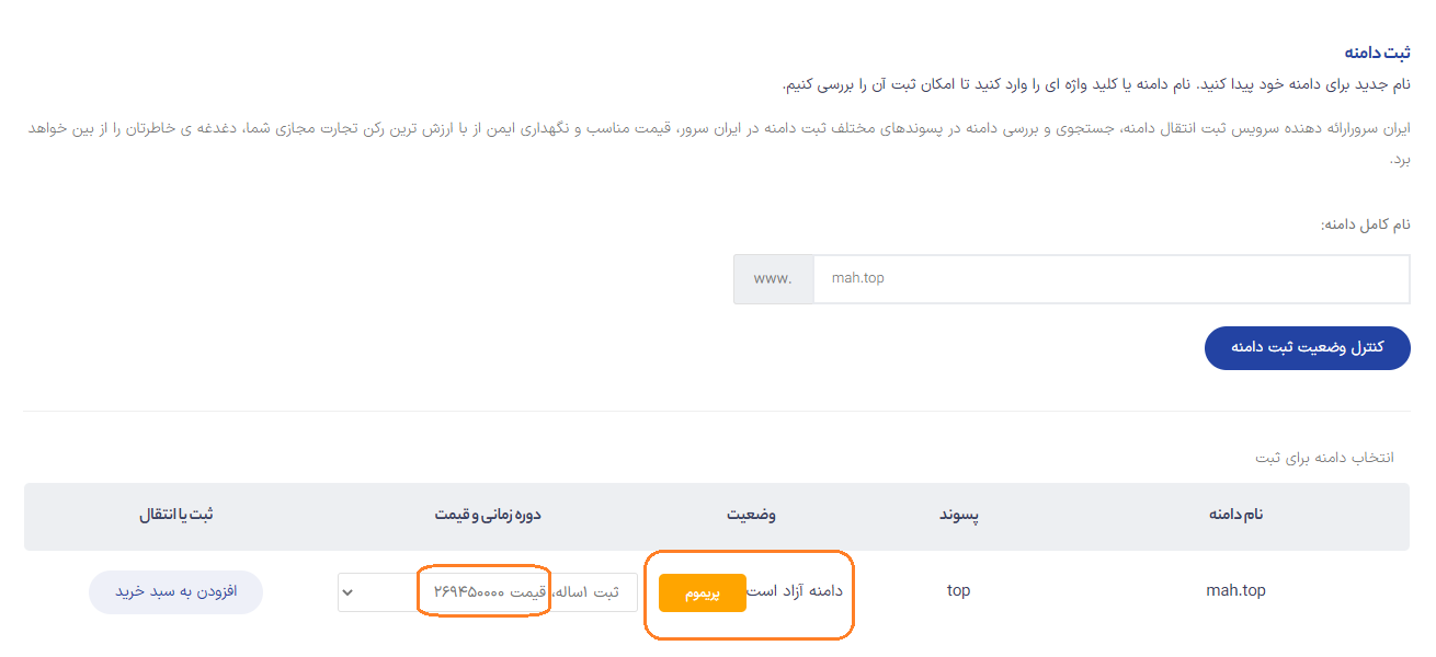 در صفحهی ثبت دامنه، اگر نام دامنهٔ وارد شده پرمیوم باشد، با تصویر زیر مواجه خواهید شد: