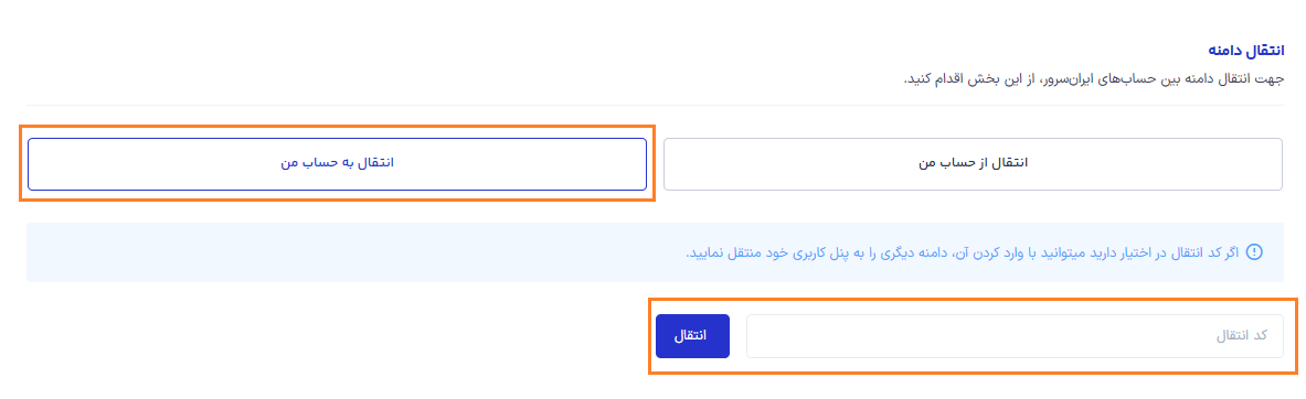 مالک جدید دامنه میبایست وارد حساب کاربری خود شده و از تب «دامنهها» گزینهٔ «انتقال مالکیت دامنه» را انتخاب کند.
