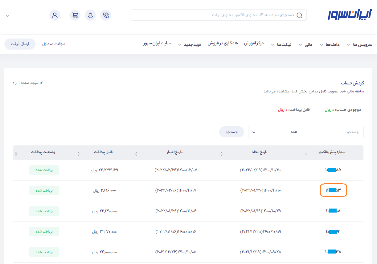 سپس بر روی شماره فاکتور مد نظر که قصد دانلود نسخهٔ رسمی آن را دارید کلیک کنید.