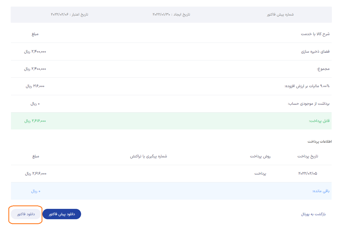 در پایین صفحهٔ فاکتور، با کلیک بر روی گزینهٔ «دانلود فاکتور»، نسخهٔ رسمی فاکتور دانلود میشود.